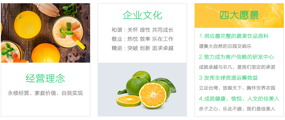 在公司發(fā)展壯大的13年里,我們始終為客戶提供好的產(chǎn)品和技術(shù)支持、健全的售后服務(wù),不斷引進(jìn)國(guó)外的先進(jìn)技術(shù)和科學(xué)管理模式,逐步健全了與產(chǎn)品發(fā)展相適應(yīng)的具有農(nóng)產(chǎn)品加工特點(diǎn)的質(zhì)量管理體系,全體職員本著“和諧、敬業(yè)、精進(jìn)”的理念,竭誠(chéng)為國(guó)內(nèi)外的顧客提供最優(yōu)質(zhì)的服務(wù)。我公司采用國(guó)內(nèi)、外先進(jìn)生產(chǎn)設(shè)備,年生產(chǎn)能力20000噸以上,主要產(chǎn)品包括:橙濃縮汁、蜜橘濃縮汁、柑橘原汁、檸檬原汁、血橙濃縮汁、芒果漿、橙果粒罐頭、橙瓣罐頭、白柚果粒罐頭、仙草凍罐頭、檸檬切片罐頭、速凍橙蓉、速凍檸檬蓉、速凍橙皮(丁、絲)、速凍檸檬皮(丁、絲)、蜜漬橙皮檸檬片、柚子等。南充佳美產(chǎn)品行銷覆蓋全國(guó)及遠(yuǎn)銷海內(nèi)外,是國(guó)內(nèi)濃縮汁、原汁、及速凍產(chǎn)品行業(yè)規(guī)格最大、最具競(jìng)爭(zhēng)力的企業(yè)之一,期待與您的合作。